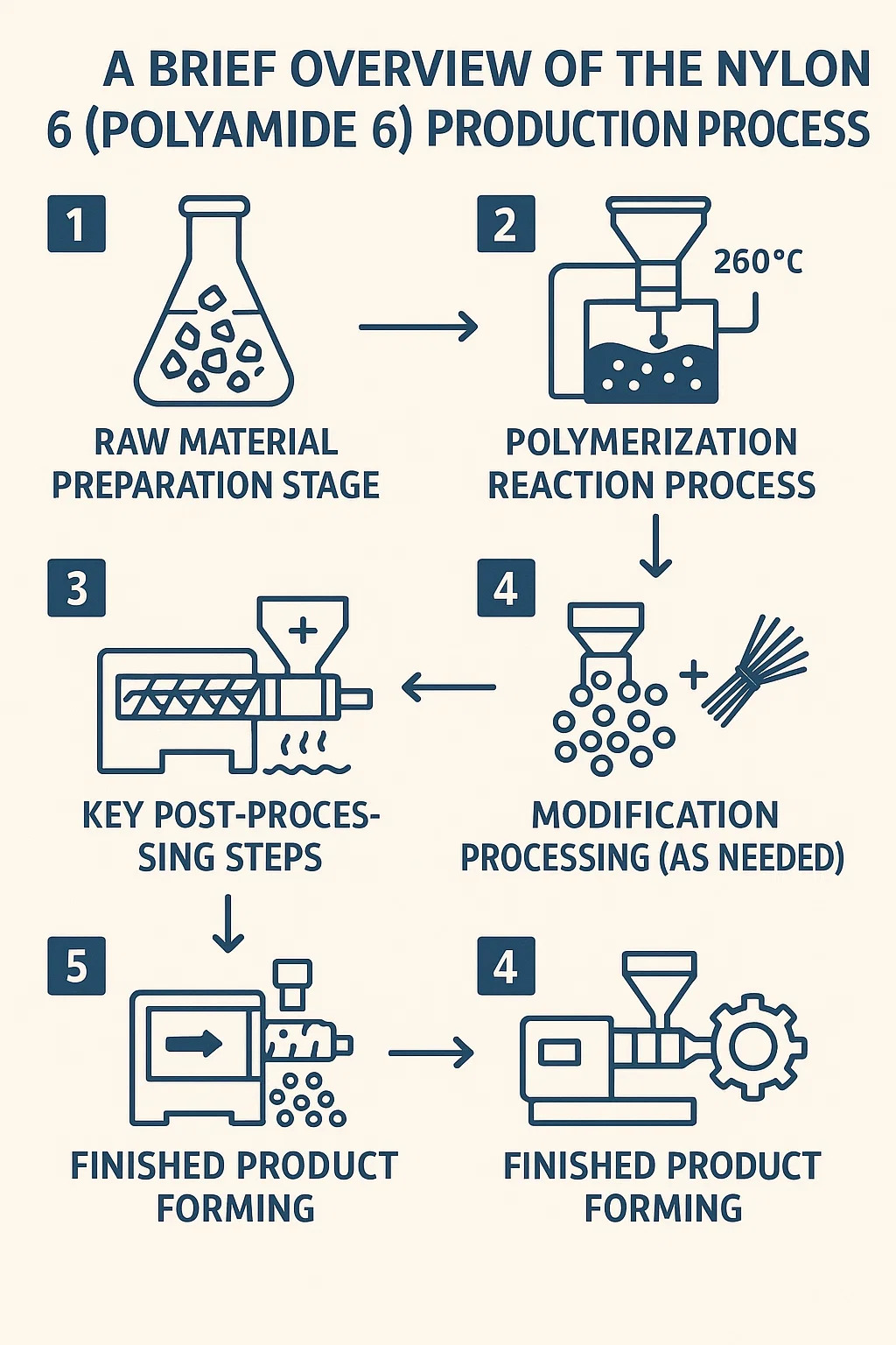 معالجة المونومر الأساسي: استخدام الكابرولاكتام (مشتق بترولي، يظهر على شكل بلورات بيضاء تشبه السكر)، والذي يحتاج إلى التنقية لإزالة الشوائب المعدنية (يمكن لأيونات الحديد أن تسبب تغير لون المنتج النهائي).