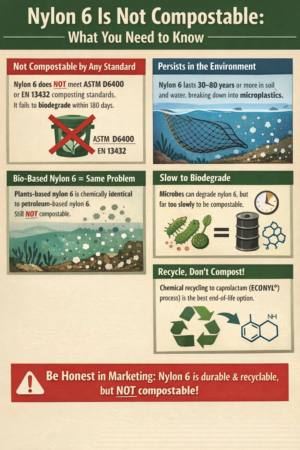 - لا تقم بوضع علامة على المنتجات التي تحتوي على النايلون 6 على أنها قابلة للتحلل أو التحلل البيولوجي أو "تعود إلى الطبيعة" — فهذا غير دقيق ويشكل في العديد من الأسواق انتهاكًا تنظيميًا بموجب تشريعات المطالبات الخضراء.