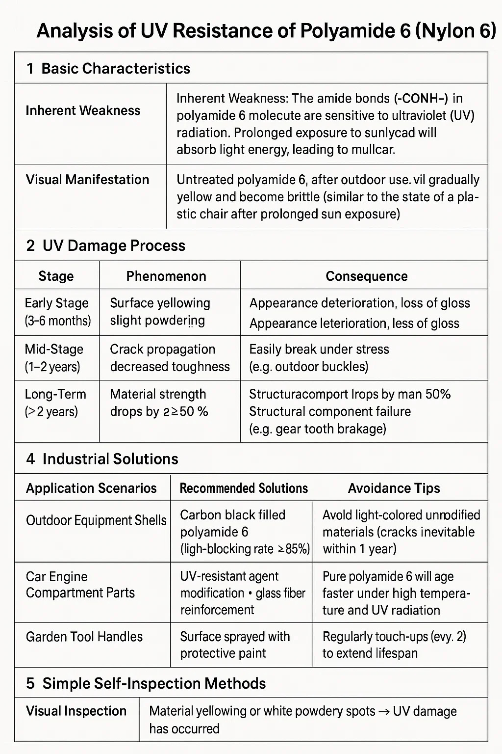 الضعف المتأصل: الروابط الأميدية (-CONH-) في جزيء البولي أميد 6 حساسة للأشعة فوق البنفسجية (UV). إن التعرض لأشعة الشمس لفترة طويلة سوف يمتص طاقة الضوء، مما يؤدي إلى كسر السلسلة الجزيئية.