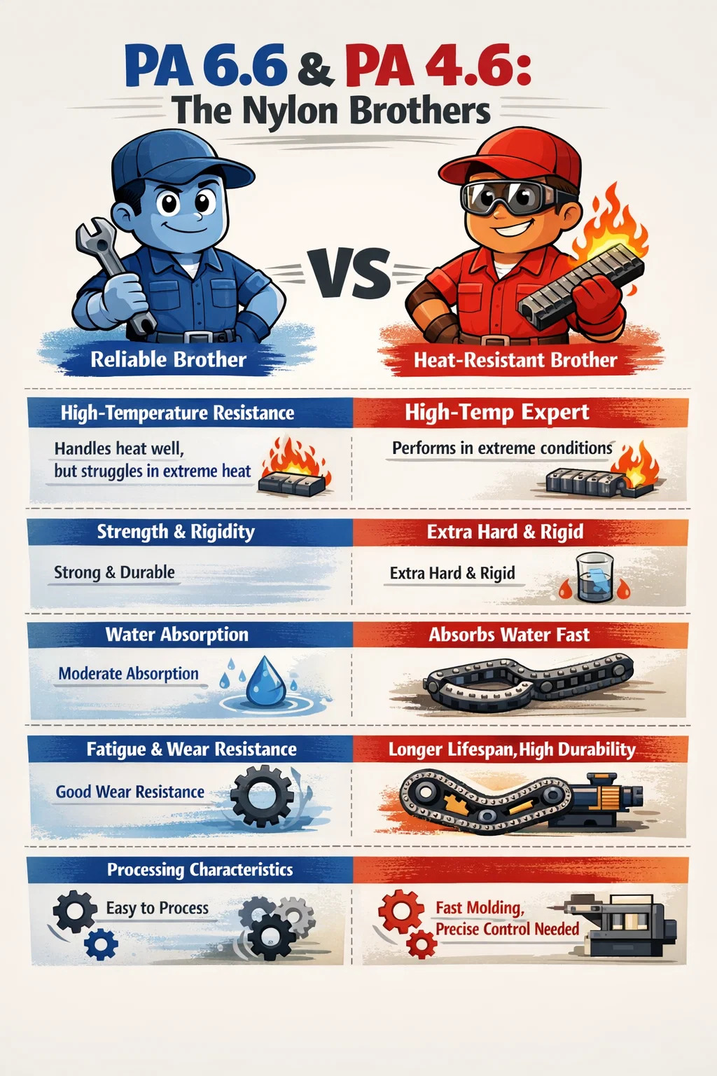 في عائلة النايلون، يعتبر PA 6.6 وPA 4.6 بمثابة شقيقين، متشابهين في المظهر ولكن لهما شخصيات وقدرات مميزة. ينتمي كلاهما إلى عائلة البولي أميد، لكن أداءهما يختلف تمامًا عند التعامل مع درجات الحرارة المرتفعة والتطبيقات ذات الضغط العالي.