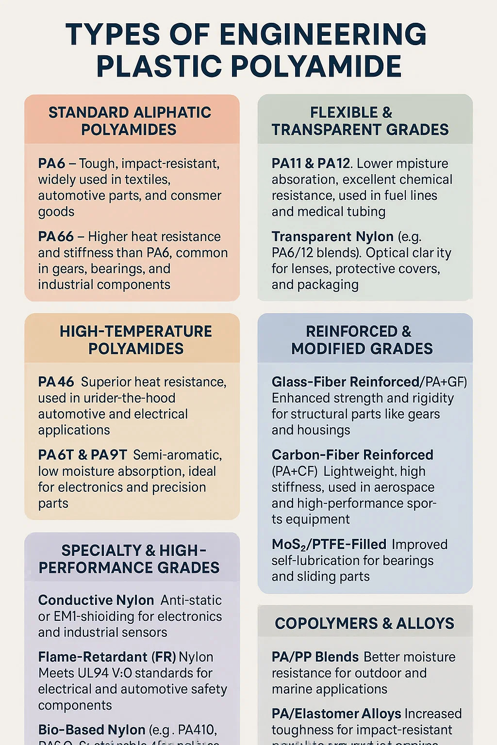 PA6 – قوي، مقاوم للصدمات، يستخدم على نطاق واسع في المنسوجات وقطع غيار السيارات والسلع الاستهلاكية.