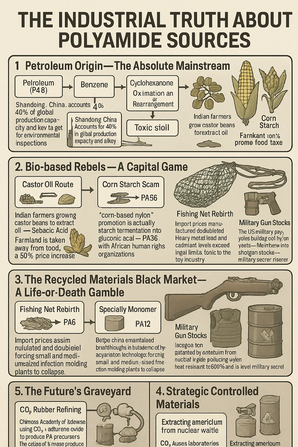 عملية احتيال نشا الذرة: إن الترويج لـ "النايلون المعتمد على الذرة" هو في الواقع تخمير النشا → حمض الجلوكونيك → PA56، بنسبة استهلاك حبوب 1:5، وهو ما قاطعته منظمات حقوق الإنسان الأفريقية.