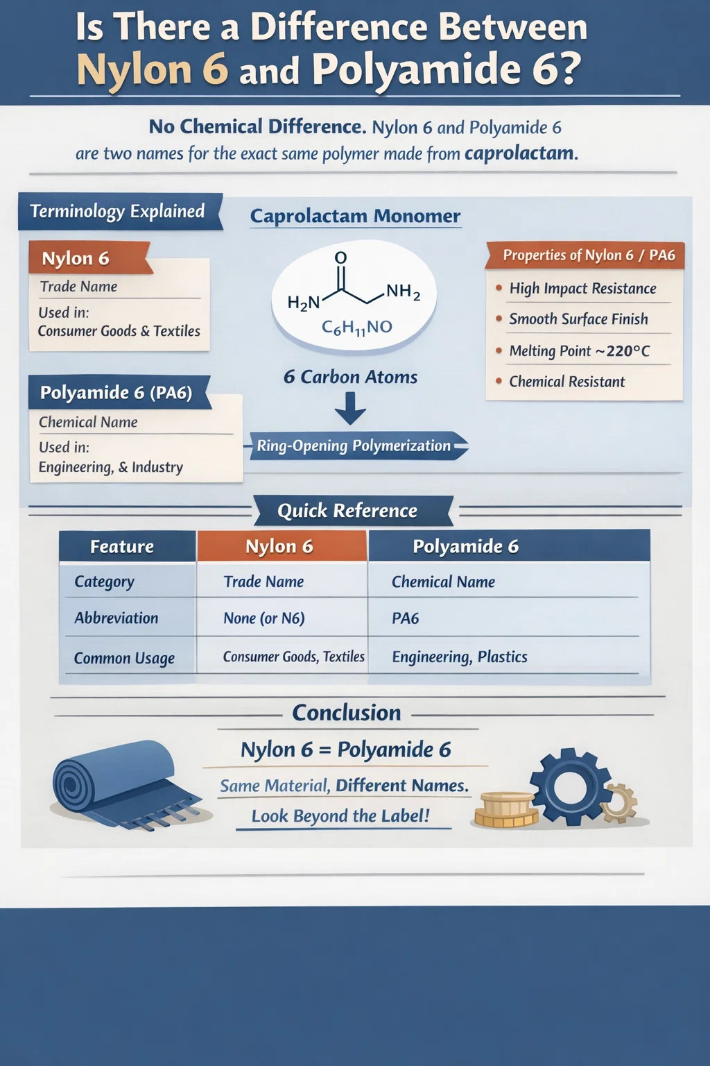 بكل بساطة: لا يوجد فرق كيميائي بين النايلون 6 والبولي أميد 6. إنهما اسمان مختلفان لنفس البوليمر تمامًا. "النايلون" هو الاسم التجاري المعروف الذي صاغته شركة دوبونت في الأصل، في حين أن "البولي أميد" هو الاسم الكيميائي الرسمي المستخدم في العلوم والهندسة. عندما ترى نايلون 6 على ملصق المنتج الاستهلاكي و بولي أميد 6 وفي ورقة البيانات الفنية، يشيرون إلى نفس المادة المصنوعة من مونومرات الكابرولاكتام.